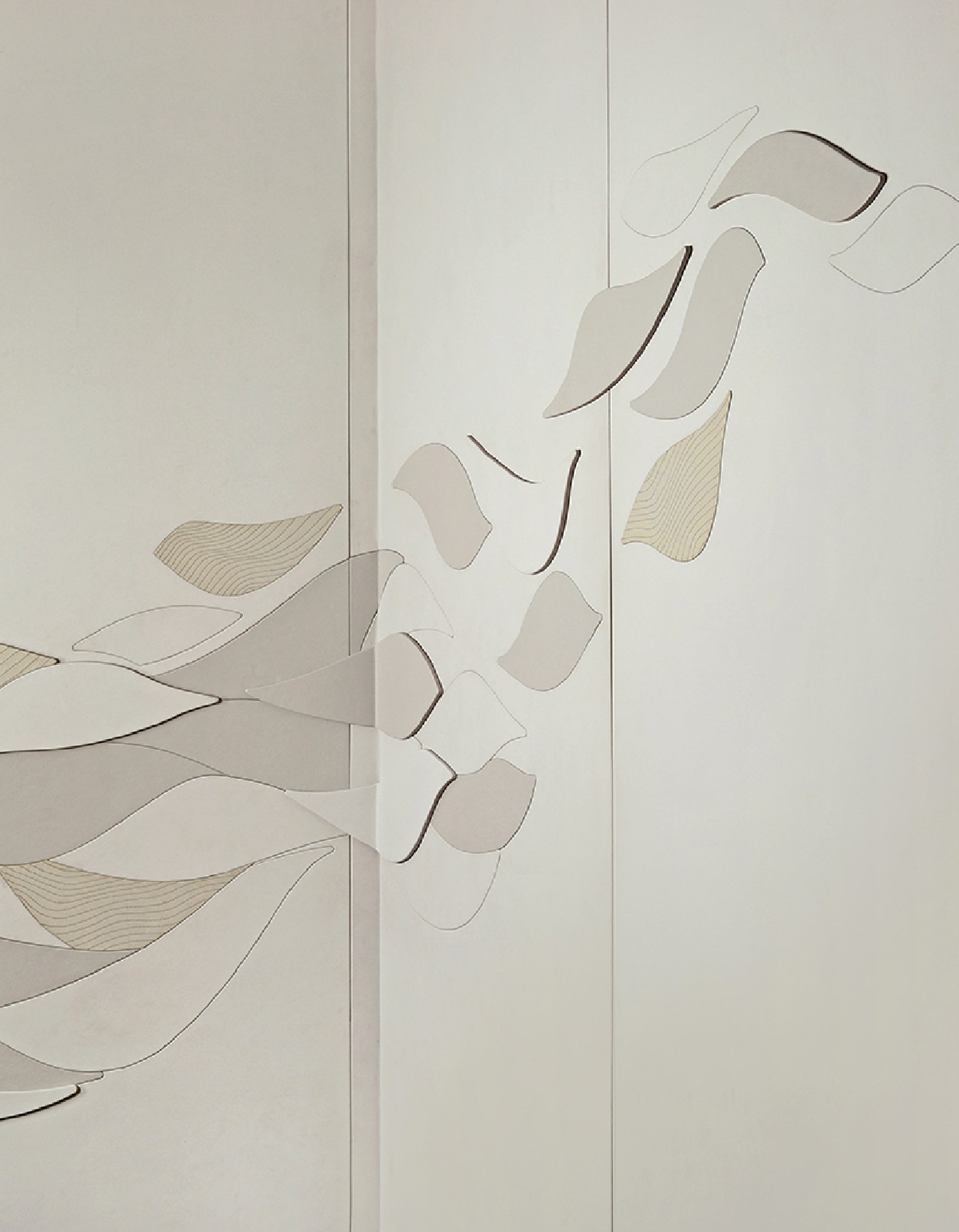 A soft, muted colour palette, creates greater definition with shadows changing between day and night. The organic wing-like elements use several tones, embellished with hand stitching and alerting depths to mimic an undulating movement, representing the beauty and complexity of the natural world.