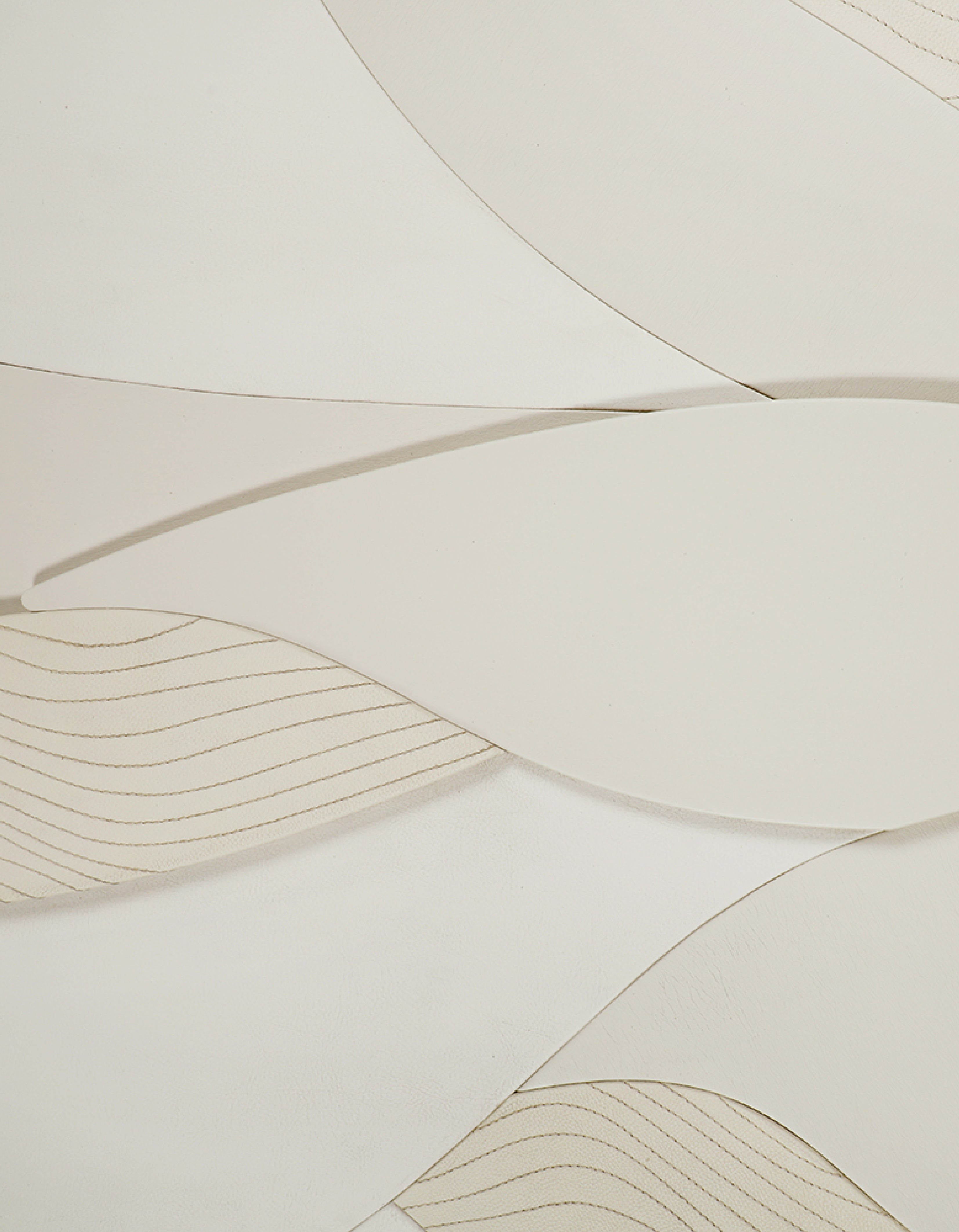 Based on the movement of the birds themselves, a composition of interlocking wing-like leather elements are shaped and moulded to create a sense of flow and motion.